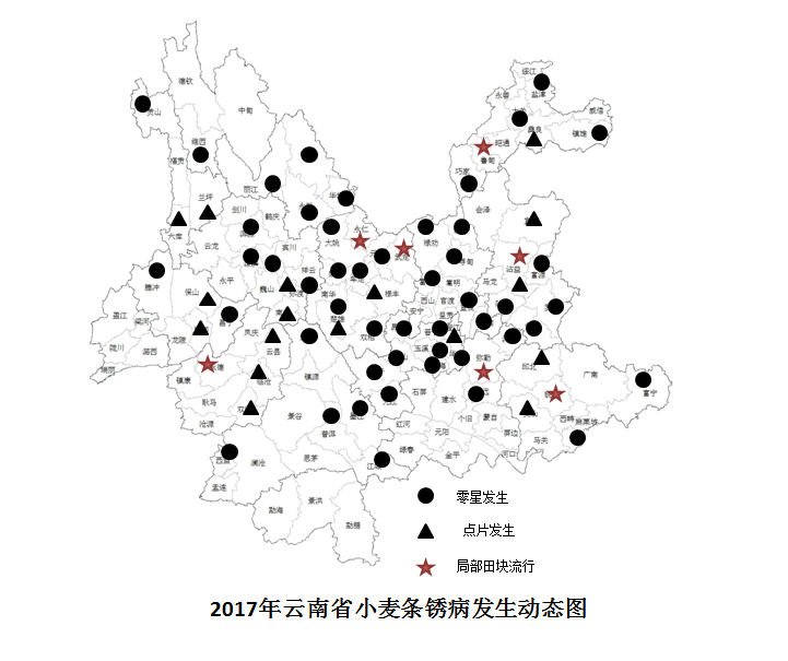 1月以來,全省大部分地區(qū)暖冬氣候明顯,我省小麥條銹病發(fā)展較快。截至2月14日,全省73個縣發(fā)生小麥條銹病,其中,彌勒市、魯?shù)榭h、硯山縣、永德縣、沾益區(qū)、永仁縣、武定縣等7個縣(市、區(qū))發(fā)生相對突出,局部區(qū)域開始流行。全省小麥條銹病發(fā)生面積達(dá)到25.81萬畝,比1月10日發(fā)生面積2萬畝,增23.81萬畝,增10倍;比去年同期增17.26萬畝,增2倍 (發(fā)生分布見下圖) 。