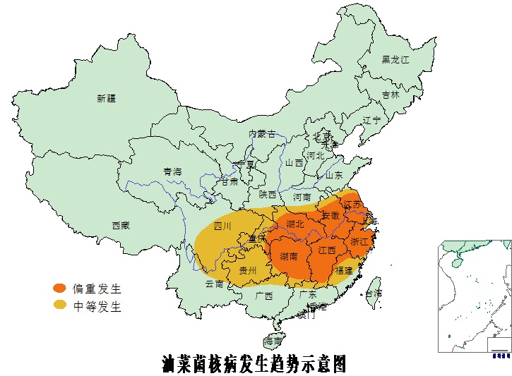今年油菜生育期偏早,菌核病主發(fā)區(qū)菌源量大,田間子囊盤密度較高,子囊盤盛發(fā)期與油菜盛花期同步時(shí)間長,前期油菜主產(chǎn)區(qū)多降雨過程,田間濕度大,加之感病品種比例高,這些條件均有利于菌核病的發(fā)生為害。預(yù)計(jì)全國秋播油菜菌核病總體偏重發(fā)生,發(fā)生面積約4800萬畝。其中江南和長江中下游大部偏重發(fā)生,黃淮和西南大部中等發(fā)生。發(fā)病盛期,西南、江南、長江中下游大部為3月中下旬至4月中旬,黃淮、陜西關(guān)中為4月中旬至5月上旬。