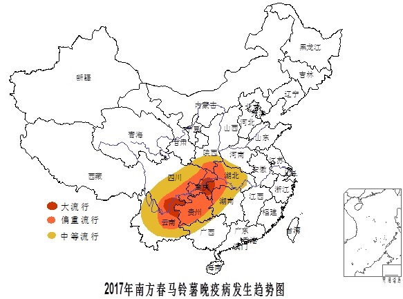 據(jù)國(guó)家氣候中心預(yù)測(cè),4-7月份,南方春馬鈴薯主產(chǎn)區(qū)氣溫正;蚱撸4月下旬至5月份,西南南部等馬鈴薯主產(chǎn)區(qū)降水較常年偏多1-2成,局地偏多2-5成;6-7月份,降水正;蚱伲髂霞拔淞晟絽^(qū)馬鈴薯主產(chǎn)區(qū)多為山區(qū)和丘陵地區(qū),多霧多露、日暖夜涼的高濕天氣,有利于馬鈴薯晚疫病的流行為害。