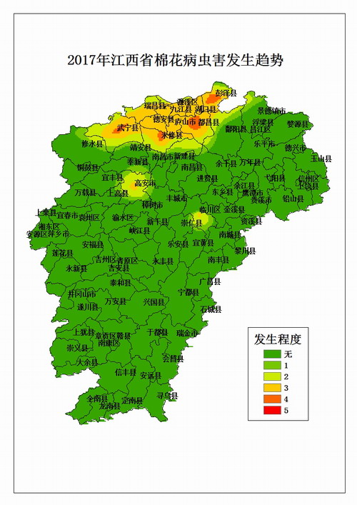 4、氣候因素。 據(jù)省氣象部門預(yù)計,2017年汛期全省總降水量略偏多,有階段性低溫連陰雨天氣,汛期贛北、贛中雨量偏多,對苗期病害、枯萎病和棉盲蝽的發(fā)生有利;伏秋期全省氣溫略偏高,雨量略偏少,全省有干旱發(fā)生,盛夏高溫日數(shù)略偏多,有利于紅蜘蛛、斜紋夜蛾和四、五代棉鈴蟲等害蟲的發(fā)生。