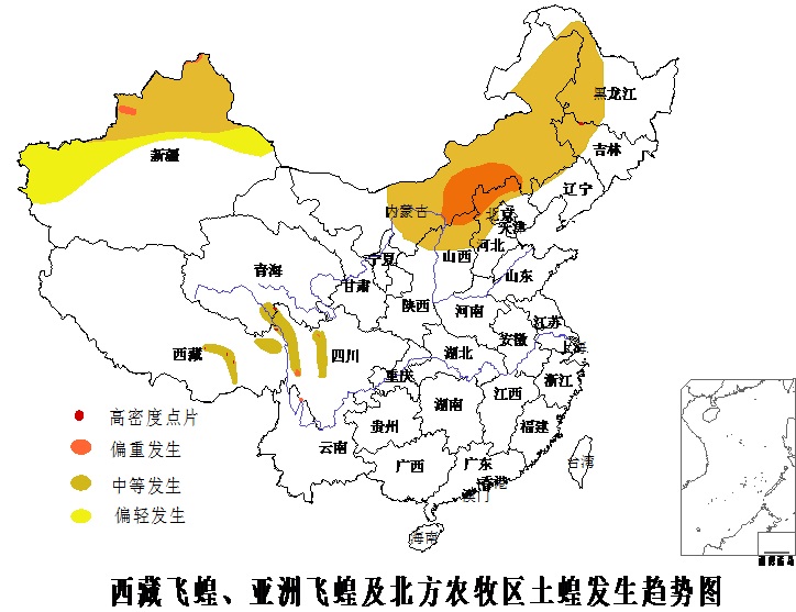 據(jù)國家氣候中心預(yù)測,4月下旬,新疆平均氣溫較常年同期偏高1~2℃,新疆西部地區(qū)有明顯降水過程,有利于亞洲飛蝗孵化發(fā)育。內(nèi)蒙古東部、東北北部氣溫由前期明顯偏高轉(zhuǎn)為偏低1℃左右,其余大部氣溫接近常年,對亞洲飛蝗和土蝗的孵化出土無不利影響。5月份東北大部,內(nèi)蒙古中東部氣溫較常年偏高1℃左右,新疆西北部氣溫接近常年,降水接近常年,這有利于亞洲飛蝗和土蝗的出土為害。西南地區(qū)氣溫接近常年,川藏大部降水偏多1~2成,對西藏飛蝗發(fā)生無不利影響。