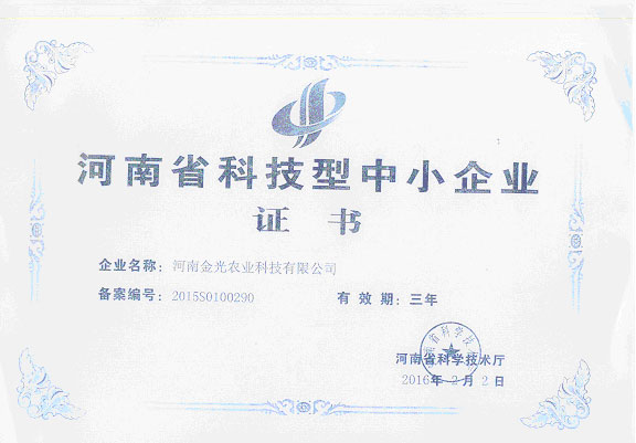 熱烈慶祝河南金光農(nóng)業(yè)科技有限公司榮獲“河南省科技型中小企業(yè)”榮譽(yù)稱號(hào)!河南省科學(xué)技術(shù)廳為我公司頒發(fā)了“河南省科技型中小企業(yè)”榮譽(yù)證書。這是我省對(duì)高新技術(shù)產(chǎn)品、科技服務(wù)型公司的最高榮譽(yù);是對(duì)我公司知識(shí)產(chǎn)權(quán)、專有技術(shù)、高新科技的充分肯定!