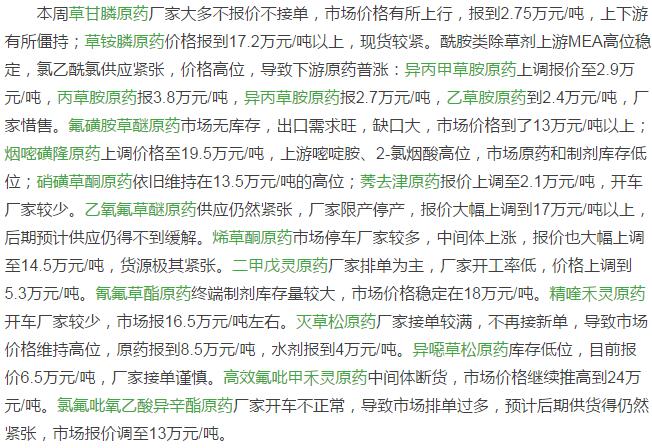 9月中旬國內(nèi)農(nóng)藥原藥除草劑價格行情