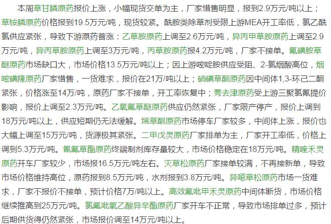9月下旬國(guó)內(nèi)農(nóng)藥原藥除草劑價(jià)格行情