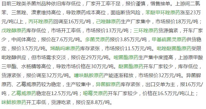 多款原藥貨源緊張價格提升