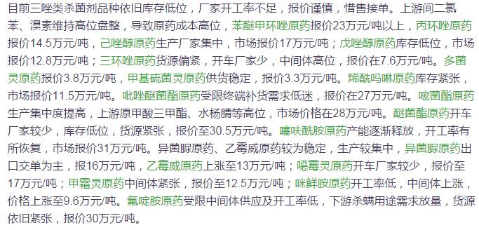 多款原藥貨源緊張價格提升