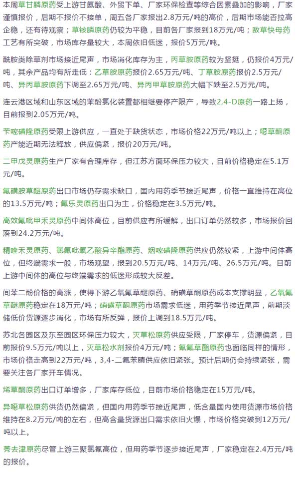 4月下旬國內農(nóng)藥原藥除草劑市場行情