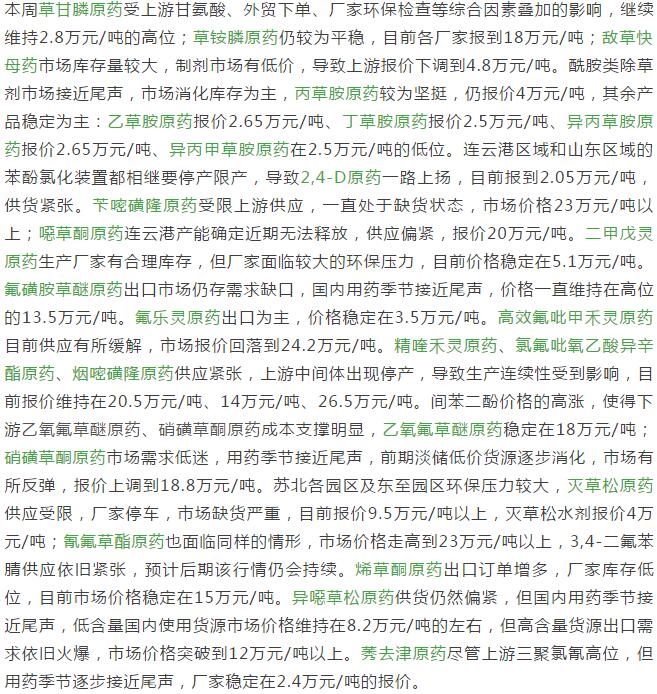 5月中旬國內(nèi)農(nóng)藥原藥除草劑價格行情