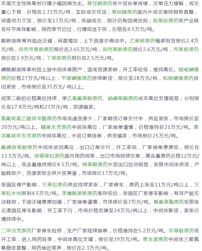 7月中旬國(guó)內(nèi)農(nóng)藥原藥除草劑行情走勢(shì)