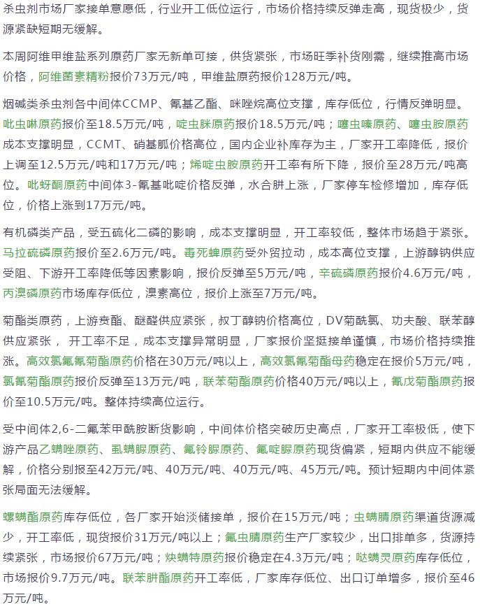 多款原藥貨源緊張價格提升
