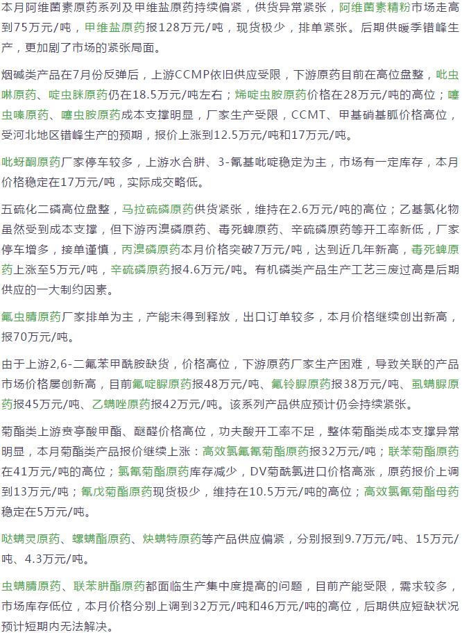 7月份國內(nèi)農(nóng)藥原藥殺蟲劑市場行情走勢