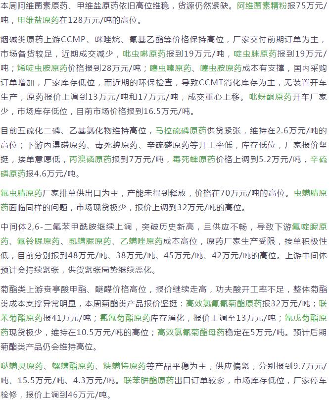 多款原藥貨源緊張價格提升