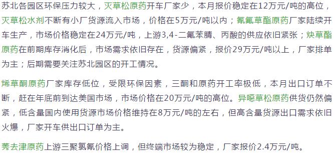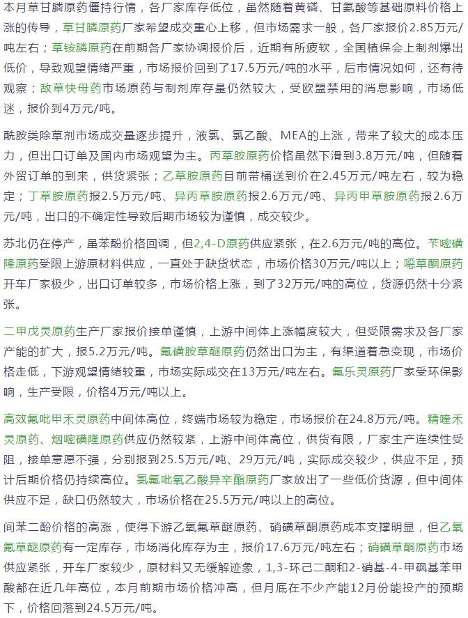 11月底國(guó)內(nèi)農(nóng)藥原藥除草劑價(jià)格走勢(shì)