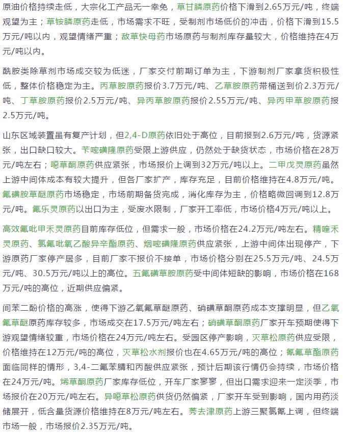 12月末國(guó)內(nèi)農(nóng)藥原藥除草劑價(jià)格走勢(shì)