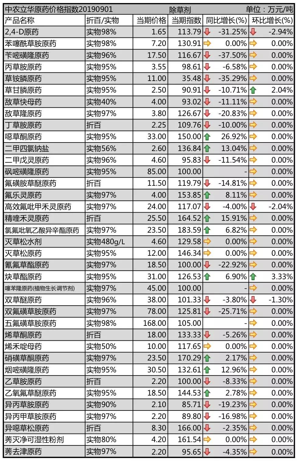 部分選擇性除草劑品種雖然供應(yīng)緊張,但市場(chǎng)淡季,終端需求較弱;整體除草劑品種極為平淡,2019年09月01日發(fā)布的中農(nóng)立華除草劑原藥價(jià)格指數(shù)報(bào)99.11點(diǎn),同比去年大幅下跌8.38%。