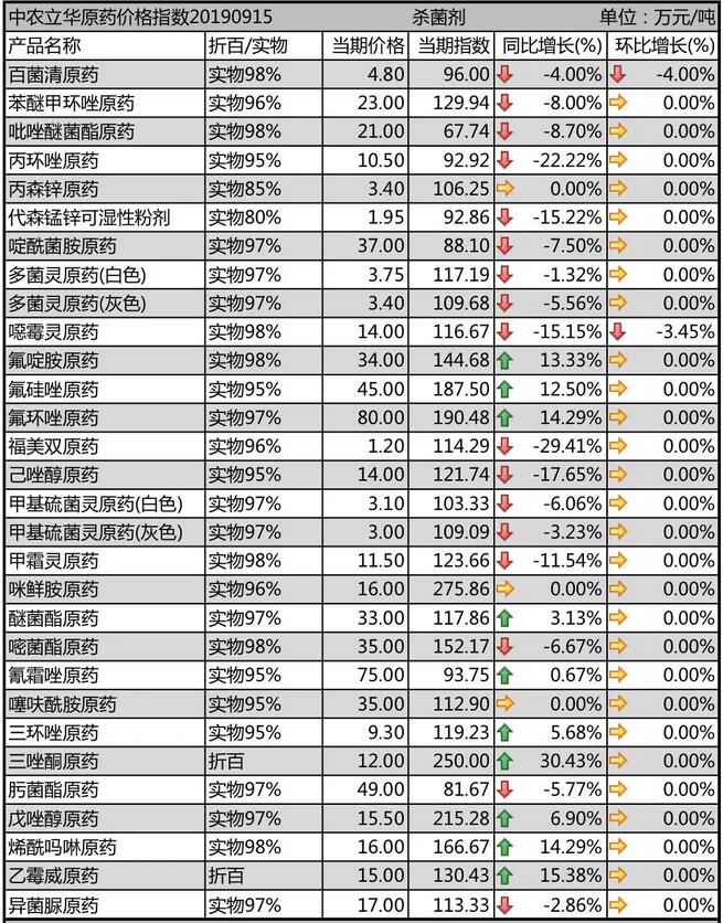 殺菌劑的主要生產(chǎn)基地集中在江蘇,殺菌劑市場供應(yīng)壓力大,需求淡季,價格出現(xiàn)季節(jié)性回調(diào)。2019年09月15日發(fā)布的中農(nóng)立華殺菌劑原藥價格指數(shù)報129.60點,環(huán)比上月上漲1.41%,隨著備貨季節(jié)到來,成交回暖。