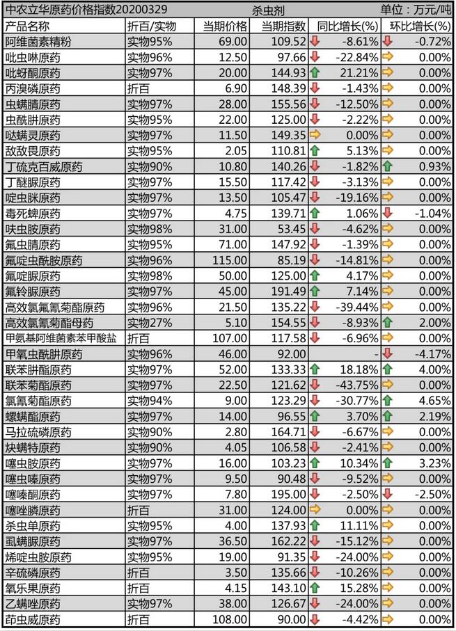 噠螨靈原藥開工率回升,供應(yīng)穩(wěn)定,報價11.5萬元/噸。螺螨酯原藥、炔螨特原藥等用藥季節(jié)到來,價格上漲,分別報到14萬元/噸、4.05萬元/噸,庫存較低,供貨偏緊。茚蟲威原藥需求增多,庫存減少,市場價格在108萬元/噸。