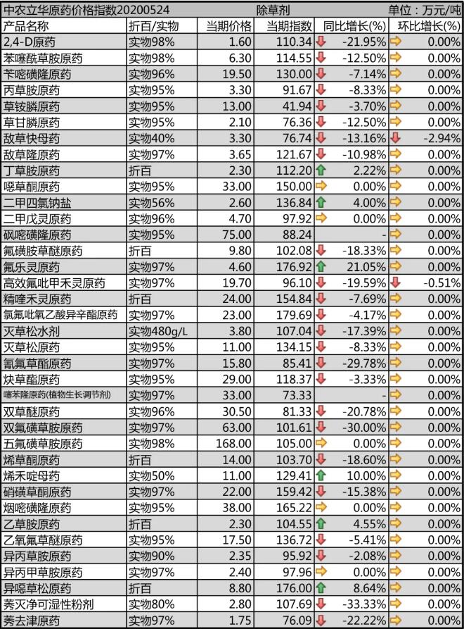 2,4-D原藥庫存減少,廠家排單增多,價(jià)格報(bào)到1.6萬元/噸;噁草酮原藥開車廠家極少,出口訂單缺口較大,報(bào)價(jià)在33萬元/噸的高位,供應(yīng)仍然十分緊張;莠去津原藥廠家?guī)齑孑^大,報(bào)價(jià)1.75萬元/噸。