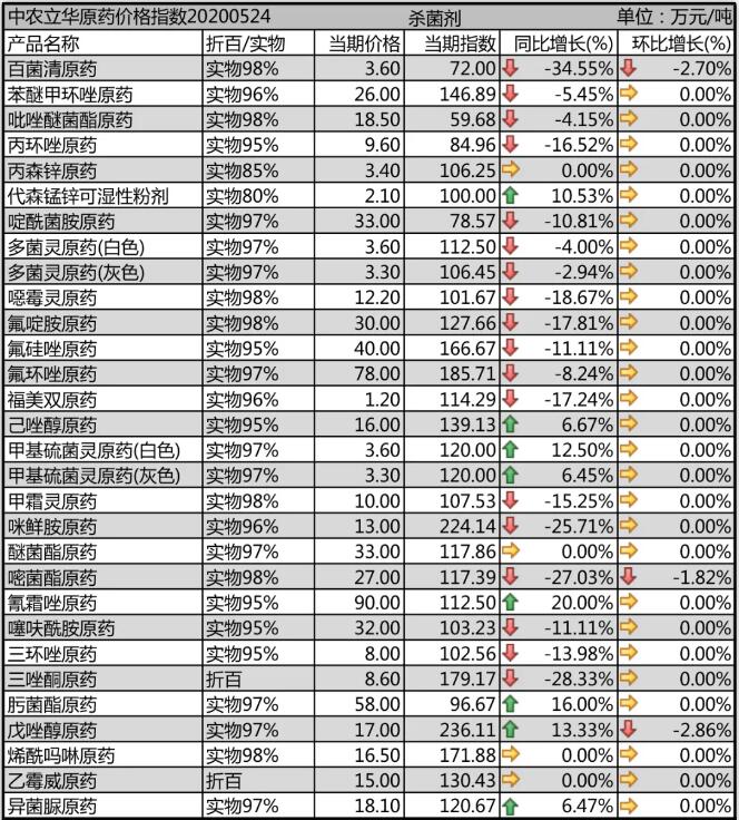苯醚甲環(huán)唑原藥開工率低,庫存少,市場價格依舊在26萬元/噸的高位,供貨缺口較大;丙環(huán)唑原藥雖然供應(yīng)偏緊,但價格維持低位,前期市場政府招標消化部分庫存,目前價格報9.6萬元/噸;己唑醇原藥需求提升,開工率低,市場價格報16萬元/噸,短期供應(yīng)緊張;戊唑醇原藥廠家開工率提升,雖然市場庫存低位,但目前性價比較低,市場信心不足,報價回落到17萬元/噸,開工率有所提升;三環(huán)唑原藥市場報到8萬元/噸;氟環(huán)唑原藥市場貨源依舊偏緊,流通貨源在78萬元/噸;氟硅唑原藥市場生產(chǎn)廠家少,報價40萬元/噸左右。
