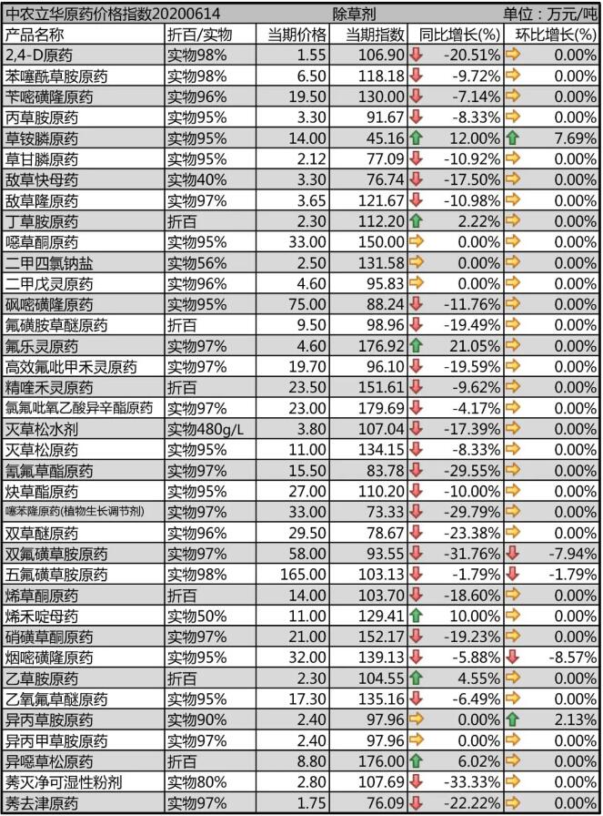 2,4-D原藥庫存減少,廠家排單增多,本月價格穩(wěn)定在1.55萬元/噸。噁草酮原藥開車廠家極少,出口訂單缺口較大,報價在33萬元/噸的高位,供應(yīng)仍然十分緊張。莠去津原藥廠家?guī)齑孑^大,報價1.75萬元/噸。