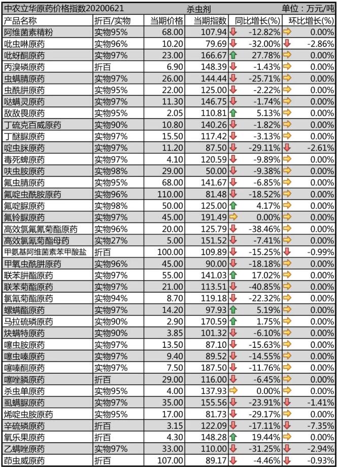 馬拉硫磷原藥受蝗災(zāi)出口訂單增多的影響,市場依舊在2.9萬元/噸的高位;丙溴磷原藥穩(wěn)定在6.9萬元/噸;毒死蜱原藥受成本影響,目前各廠家不輕易接單報(bào)價(jià),市場價(jià)格在4.1萬元/噸;辛硫磷原藥需求弱勢,報(bào)價(jià)3.15萬元/噸。
