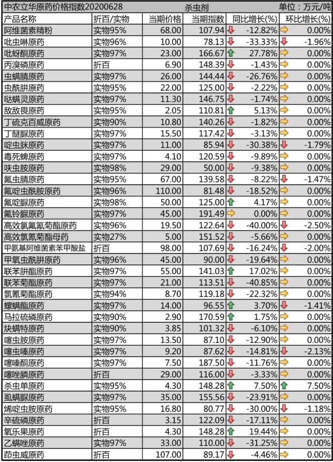阿維菌素精粉市場穩(wěn)定,報價68萬元/噸;甲氨基阿維菌素苯甲酸鹽原藥保持穩(wěn)定,出口訂單逐步增多,但整體下行的市場環(huán)境,讓市場價格走低至98萬元/噸。