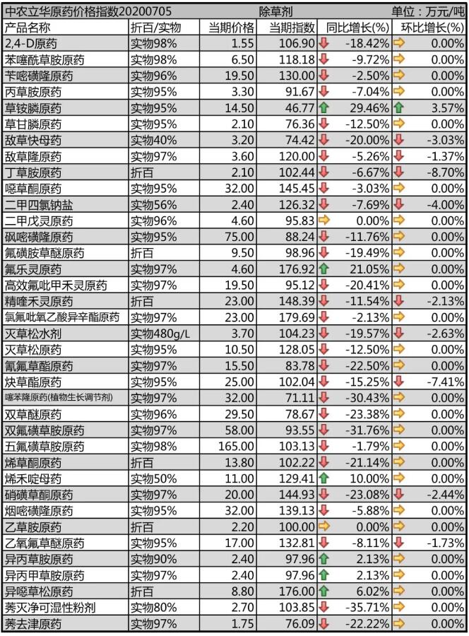 2,4-D原藥庫存減少,廠家排單增多,價格報到1.55萬元/噸;噁草酮原藥貨源緊張,內貿用藥結束,出口訂單缺口較大,報價在33萬元/噸的高位;莠去津原藥廠家?guī)齑孑^大,報價1.75萬元/噸。