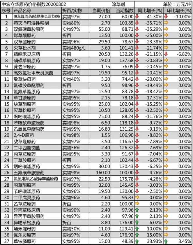 2,4-D原藥開(kāi)工率平穩(wěn),本月價(jià)格穩(wěn)定在1.55萬(wàn)元/噸。噁草酮原藥開(kāi)工廠家極少,出口訂單缺口較大,報(bào)價(jià)處于32萬(wàn)元/噸的高位,供應(yīng)仍然十分緊張。莠去津原藥廠家?guī)齑孑^大,報(bào)價(jià)1.75萬(wàn)元/噸。