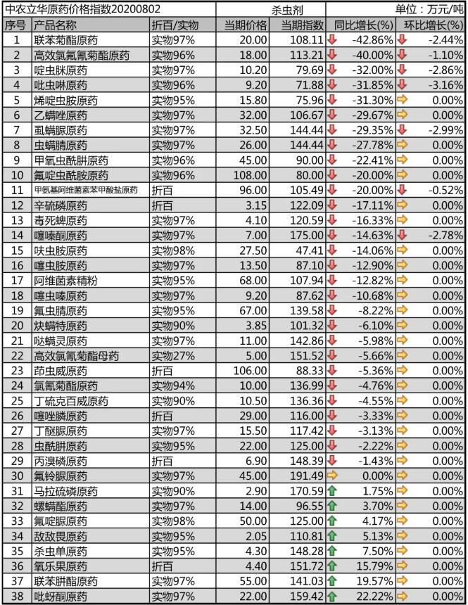 馬拉硫磷原藥受蝗災(zāi)影響,出口訂單增多,市場報價依舊處于2.9萬元/噸的高位;丙溴磷原藥穩(wěn)定在6.9萬元/噸,毒死蜱原藥出口訂單平穩(wěn),進(jìn)入市場淡季,本月報到4.1萬元/噸,辛硫磷原藥已過用藥期,目前報3.15萬元/噸。