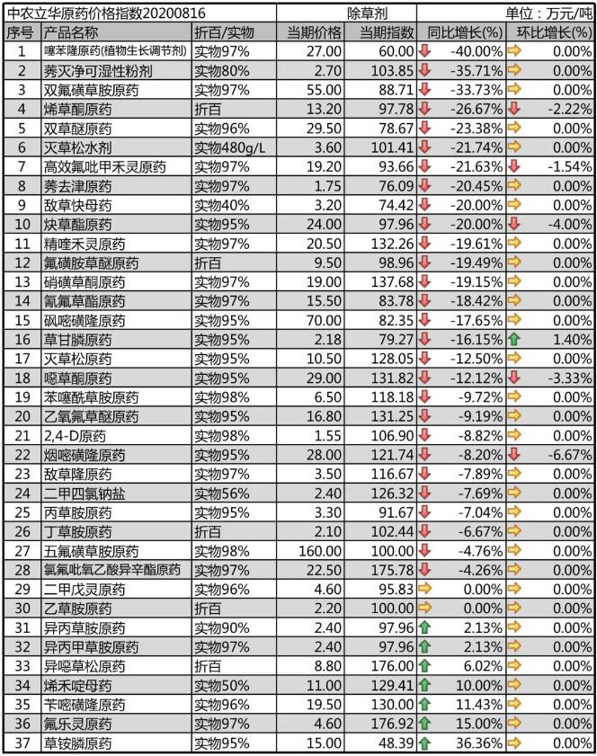 高效氟吡甲禾靈原藥終端需求一般,市場(chǎng)有庫(kù)存,出口為主,市場(chǎng)報(bào)價(jià)在19.2萬(wàn)元/噸。精喹禾靈原藥開工率提升,下游需求弱勢(shì),市場(chǎng)報(bào)價(jià)到了20.5萬(wàn)元/噸,煙嘧磺隆原藥庫(kù)存偏低,但已過(guò)用藥季節(jié),市場(chǎng)成交價(jià)回落至28萬(wàn)元/噸。氯氟吡氧乙酸異辛酯原藥庫(kù)存低位,開工率回升,市場(chǎng)報(bào)到22.5萬(wàn)元/噸。