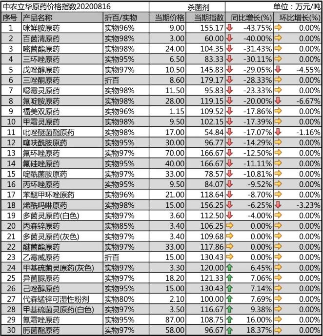 多菌靈原藥、甲基硫菌靈原藥生產(chǎn)廠家環(huán)保壓力較大,開工率一般,市場報(bào)價(jià)在3.5-3.6萬元/噸;噁霉靈原藥市場價(jià)格報(bào)至11.5萬元/噸,需求弱勢;氟啶胺原藥生產(chǎn)廠家集中,市場觀望情緒較重,目前價(jià)格下滑至28萬元/噸;咪鮮胺原藥開工率提升,但市場需求進(jìn)入淡季,價(jià)格維持低位,報(bào)到9萬元/噸。
