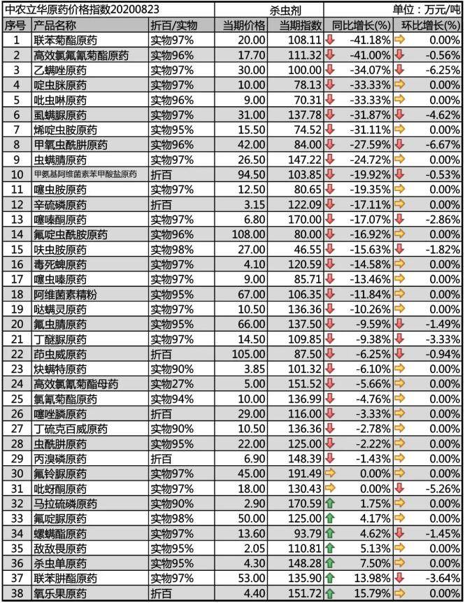 聯(lián)苯肼酯原藥、甲氧蟲酰肼原藥都面臨生產(chǎn)集中度提高的問題,受疫情影響,開工率低,目前也進(jìn)入市場(chǎng)淡季,新周期備貨逐步商談中,價(jià)格穩(wěn)定在53萬元/噸、45萬元/噸;蟲螨腈原藥市場(chǎng)面臨巨變,河北非法生產(chǎn)的案例的曝光減少了擾亂市場(chǎng)競(jìng)爭(zhēng)的不利因素,近期工廠停限產(chǎn)較多,預(yù)計(jì)后期市場(chǎng)競(jìng)爭(zhēng)格局會(huì)有所改變,市場(chǎng)價(jià)格報(bào)到26.5萬元/噸,供應(yīng)偏緊。