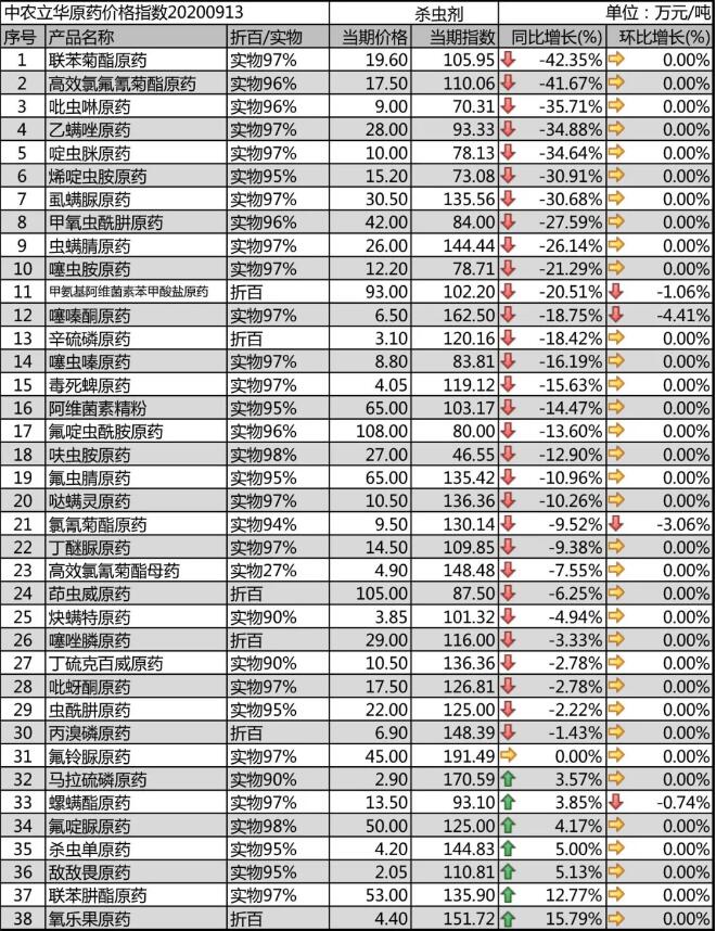 噠螨靈原藥供應(yīng)穩(wěn)定,報價10.5萬元/噸;螺螨酯原藥市場流通價格報13.5萬元/噸,較為穩(wěn)定;炔螨特原藥市場需求減弱,市場報價3.85萬元/噸;茚蟲威原藥需求增多,庫存減少,市場價格穩(wěn)定在105萬元/噸。