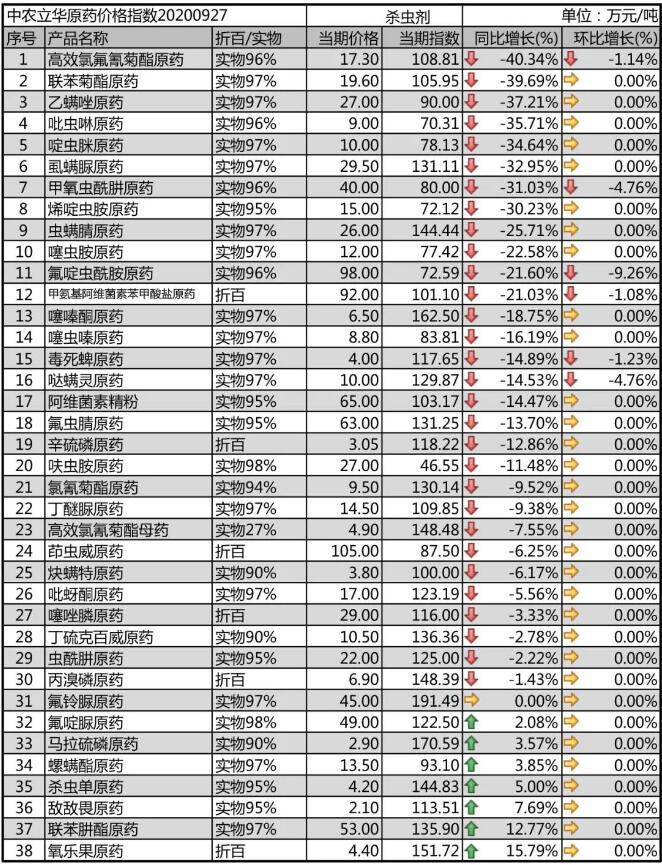 馬拉硫磷原藥受蝗災(zāi)影響,出口為主,市場報價依舊處于2.9萬元/噸的高位;丙溴磷原藥穩(wěn)定在6.9萬元/噸,毒死蜱原藥出口訂單平穩(wěn),進(jìn)入市場淡季,本月報到4萬元/噸,辛硫磷原藥傳統(tǒng)用藥淡季,目前報3.05萬元/噸。