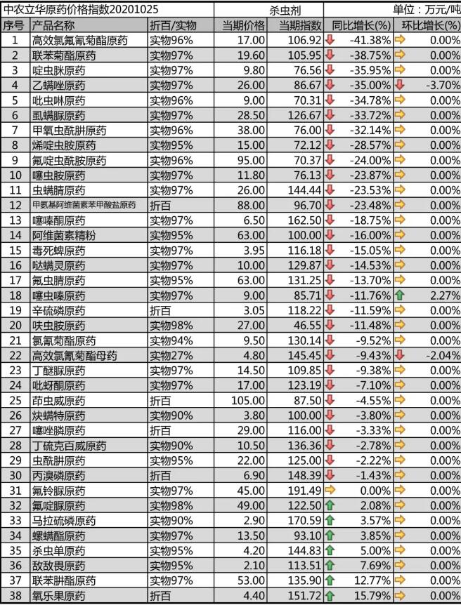 馬拉硫磷原藥受蝗災(zāi)影響,出口為主,市場報價依舊處于2.9萬元/噸的高位;丙溴磷原藥穩(wěn)定在6.9萬元/噸,毒死蜱原藥出口訂單平穩(wěn),上下游觀望為主,本周報到3.95萬元/噸,辛硫磷原藥目前報3.05萬元/噸。