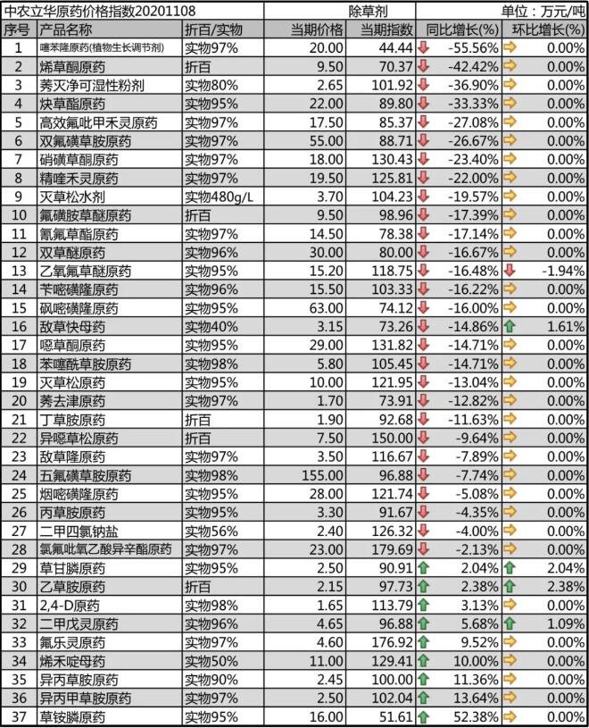 烯草酮原藥新增產(chǎn)能較多,期貨價(jià)格遠(yuǎn)低于現(xiàn)貨價(jià)格,目前價(jià)格回落至9.5萬元/噸,出口為主,預(yù)計(jì)后期廠家競爭加劇,仍將維持低位。異噁草松原藥廠家開始接淡儲(chǔ)訂單,國內(nèi)市場低含量貨源價(jià)格維持在7.5萬元/噸。雙氟磺草胺原藥市場競爭加劇,價(jià)格回落至55萬元/噸,市場處于觀望狀態(tài);噻苯隆原藥市場報(bào)價(jià)20萬元/噸,價(jià)格大幅下行,現(xiàn)有產(chǎn)能調(diào)低利潤預(yù)期,希望阻止新增產(chǎn)能投放市場,這種現(xiàn)象未來會(huì)在更多產(chǎn)品上顯現(xiàn)。砜嘧磺隆原藥需求弱勢,市場報(bào)價(jià)63萬元/噸,出口為主。