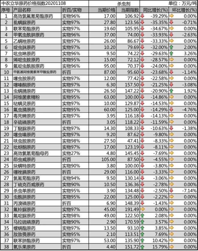 馬拉硫磷原藥受蝗災(zāi)影響,出口為主,市場報價依舊處于2.9萬元/噸的高位;丙溴磷原藥穩(wěn)定在6.9萬元/噸,毒死蜱原藥出口訂單平穩(wěn),成本高位,上下游觀望為主,報到3.95萬元/噸,辛硫磷原藥目前報3.05萬元/噸。