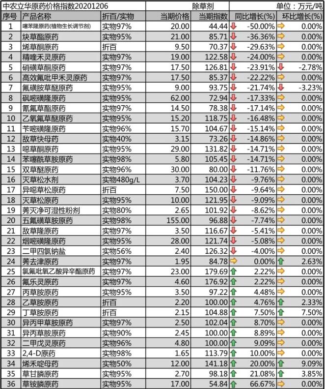 烯草酮原藥雖然新增產(chǎn)能較多,價格下跌幅度較大,但基礎原材料上行,目前報價9.5萬元/噸,出口為主,各廠家訂單排的較滿。異噁草松原藥廠家淡儲完畢,國內市場低含量貨源價格維持在7.5萬元/噸。噻苯隆原藥市場報價20萬元/噸,現(xiàn)有產(chǎn)能調低利潤預期,希望阻礙新增產(chǎn)能釋放,這在未來會出現(xiàn)在更多的產(chǎn)品上面;砜嘧磺隆原藥需求弱勢,市場報價62萬元/噸,國內用量逐步提升。