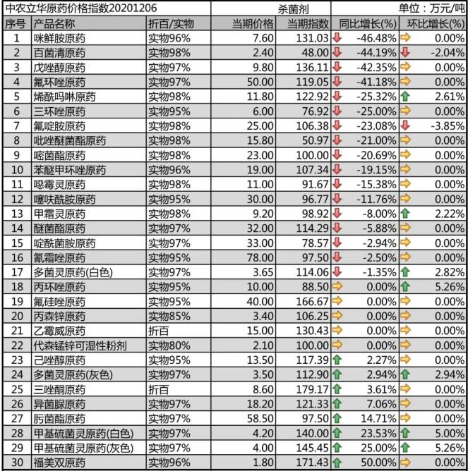 上游原材料水合肼、甲酰胺、三氮唑系列的上漲,給三唑類殺菌劑帶來了成本壓力。苯醚甲環(huán)唑原藥受下游集中采購的影響,庫存消化,市場價格反彈到19萬元/噸;丙環(huán)唑原藥價格已經(jīng)較長時間維持低位,基礎原材料的上漲,出口訂單增多,導致價格反彈,國內(nèi)市場前期簽訂訂單較多,目前價格報價10萬元/噸;己唑醇原藥開工率未見明顯提升,貨源緊張,市場報價13.5萬元/噸;戊唑醇原藥廠家開工率提升,受上游中間體上漲影響,目前報價9.8萬元/噸;三環(huán)唑原藥廠家開工率有所提升,但基礎原材料上漲帶來了成本壓力,市場報價6萬元/噸;氟環(huán)唑原藥市場開工率提升,流通貨源報價50萬元/噸,隨著價格下行,終端制劑的性價比提升。