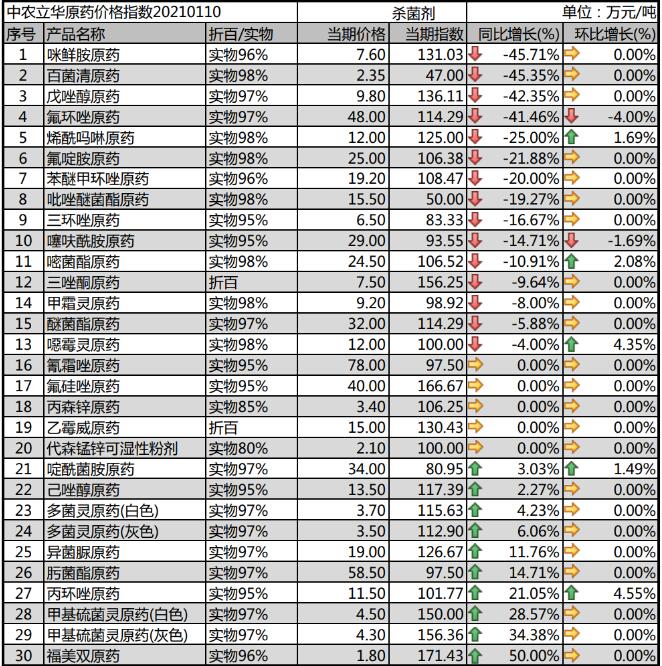 多菌靈原藥開工率一般,報(bào)價(jià)3.8萬元/噸、甲基硫菌靈原藥廠家排單較多,現(xiàn)貨十分緊張,上漲到4.5萬元/噸;噁霉靈原藥廠家開工率不足,期貨排單為主,市場(chǎng)現(xiàn)貨很少,價(jià)格報(bào)到12萬元/噸;氟啶胺原藥目前價(jià)格到25萬元/噸;咪鮮胺原藥小廠停車較多,市場(chǎng)上大廠現(xiàn)貨不多,價(jià)格報(bào)到7.6萬元/噸。