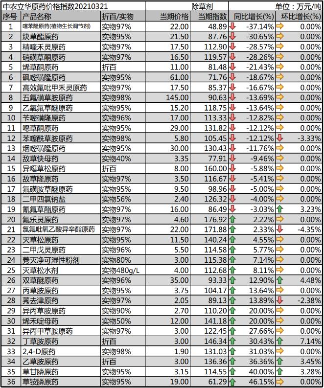 烯草酮原藥受基礎原材料上行的影響,廠家3月份排單緊張,目前價格反彈至11萬元/噸以上,期貨訂單為主,市場現(xiàn)貨少;異噁草松原藥廠家淡儲完畢,但開工率低位,市場價格有上行趨勢,國內市場低含量貨源價格報到8萬元/噸;噻苯隆原藥市場報價22萬元/噸,受開工率降低影響,價格穩(wěn)中上揚;砜嘧磺隆原藥市場報價61萬元/噸,開車廠家少,消化庫存為主。