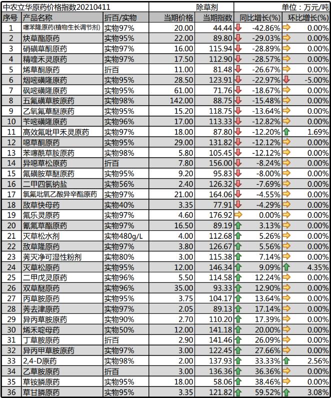 滅草松原藥市場啟動(dòng),廠家開車不正常,且?guī)齑娌欢啵袌鰣?bào)價(jià)12萬元/噸,滅草松水劑報(bào)4萬元/噸,缺貨嚴(yán)重;雙草醚原藥排單較多,中間體吃緊,價(jià)格上漲到35萬元/噸;氰氟草酯原藥前期工廠淡儲(chǔ)訂單陸續(xù)交貨,部分工廠交貨不順暢,排單到了5月份,且中間體對(duì)苯二酚出現(xiàn)斷貨,現(xiàn)貨難求,目前市場報(bào)價(jià)16.5萬元/噸;炔草酯原藥受此中間體影響,廠家上調(diào)價(jià)格到22萬元/噸。