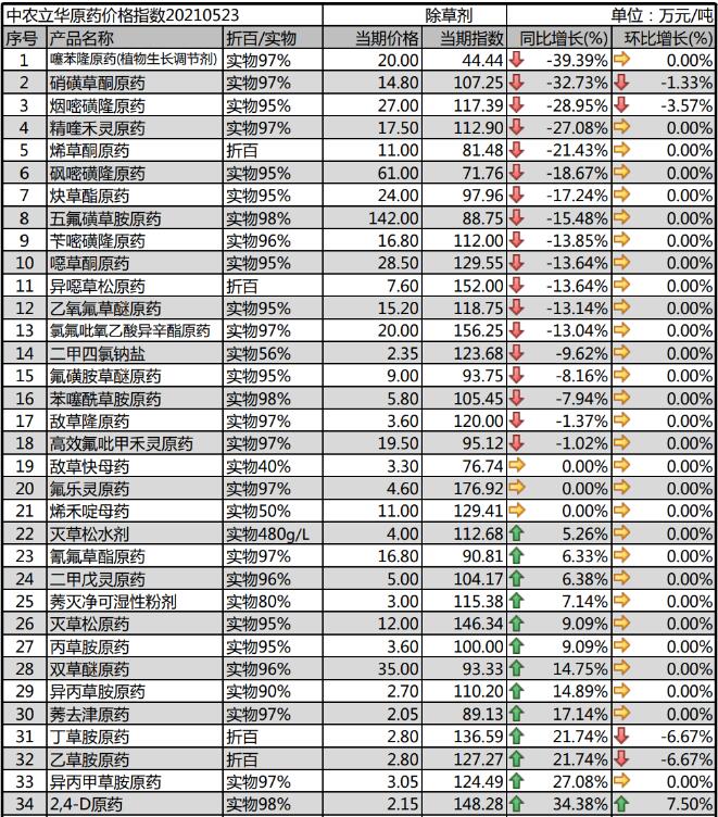 高效氟吡甲禾靈原藥中間體仍在高位,但國(guó)內(nèi)對(duì)于價(jià)格敏感度很高,渠道貨源不多,市場(chǎng)報(bào)價(jià)到19.5萬(wàn)元/噸。精喹禾靈原藥開(kāi)工率提升,市場(chǎng)報(bào)價(jià)在17.5萬(wàn)元/噸,煙嘧磺隆原藥庫(kù)存偏低,但生產(chǎn)季節(jié)后期,價(jià)格回落到27萬(wàn)元/噸。氯氟吡氧乙酸異辛酯原藥需求一般,玉米田需求基本結(jié)束,市場(chǎng)報(bào)20萬(wàn)元/噸。