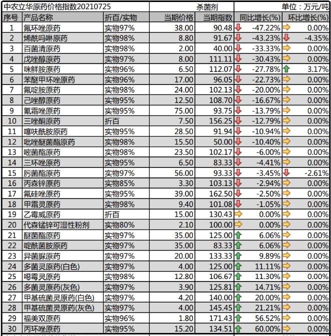 苯醚甲環(huán)唑原藥目前穩(wěn)中走低,供應增加,市場價格報17萬元/噸;丙環(huán)唑原藥廠家忙于交付前期訂單,成本高位,開工率不足,價格上漲到15.2萬元/噸;己唑醇原藥市場供應增加,價格報到12.5萬元/噸;戊唑醇原藥庫存降低,目前報到8萬元/噸;三環(huán)唑原藥廠家開工率低,基礎原材料上漲帶來了成本壓力,市場價格報到6.5萬元/噸;氟環(huán)唑原藥市場開工率提升,流通貨源價格下滑到38萬元/噸,隨著價格下行,終端制劑的性價比提升。