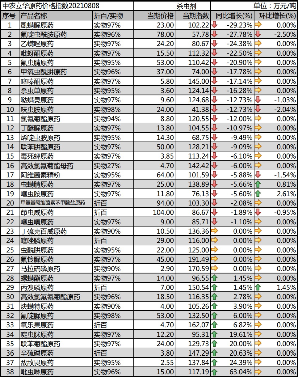 噠螨靈原藥供應(yīng)穩(wěn)定,報(bào)價(jià)9.6萬元/噸;螺螨酯原藥市場(chǎng)流通價(jià)格報(bào)14萬元/噸,供應(yīng)穩(wěn)定;炔螨特原藥市場(chǎng)需求一般,但庫存消化,市場(chǎng)報(bào)價(jià)上漲到4萬元/噸;茚蟲威原藥需求啟動(dòng),開工率偏低,市場(chǎng)庫存低位,目前價(jià)格穩(wěn)定在104萬元/噸。
