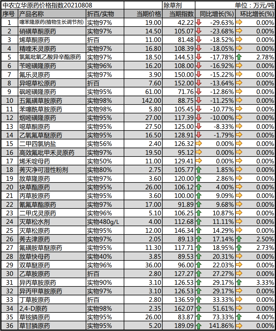 滅草松原藥廠家開工不順暢,還未釋放產(chǎn)量,市場庫存較少,市場報價12萬元/噸,滅草松水劑市場報價4萬元/噸,市場幾無庫存;氰氟草酯原藥進入用藥季節(jié)尾聲,但丙酸的價格高位,導致成本高位,市場報價17萬元/噸以上;炔草酯原藥市場同樣受到此影響,疊加三氯吡啶的上漲,成本大幅上行,市場報價在26萬元/噸;高效氟吡甲禾靈原藥也受到上游原材料大幅上行影響,市場上行到19.5萬元/噸。
