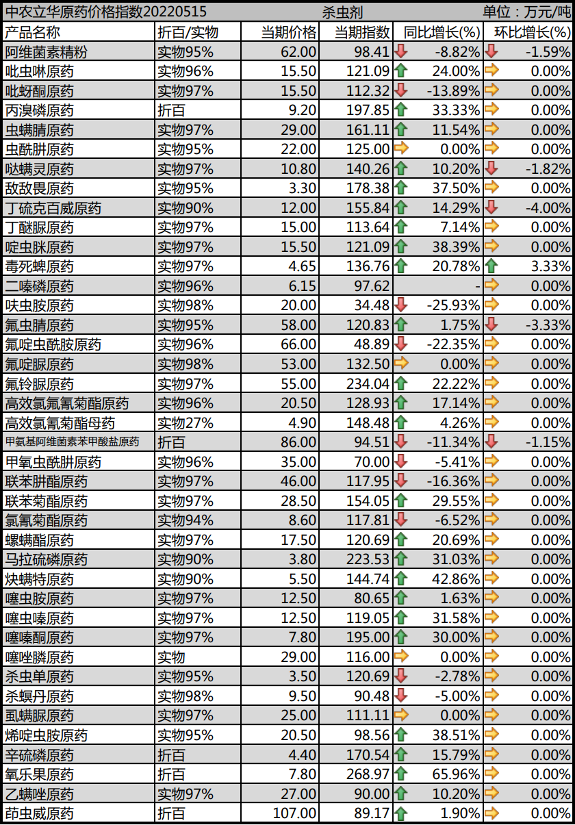 噠螨靈原藥報價到10.8萬元/噸左右,較為穩(wěn)定;螺螨酯原藥開工率低,市場穩(wěn)定,報到17.5萬元/噸左右;炔螨特原藥庫存消化,市場報5.5萬元/噸;茚蟲威原藥需求啟動,市場穩(wěn)定在107萬元/噸左右,受疫情影響,供應受到影響。