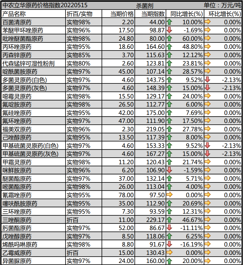 多菌靈原藥生產(chǎn)廠家環(huán)保壓力較大,市場(chǎng)報(bào)價(jià)維持在4.6萬元/噸左右;甲基硫菌靈原藥成本壓力大,市場(chǎng)價(jià)格報(bào)到4.6萬元/噸左右;噁霉靈原藥市場(chǎng)價(jià)格報(bào)至15.5萬元/噸,受疫情影響,開工率仍未提升;氟啶胺原藥庫存消化,出口市場(chǎng)良好,市場(chǎng)價(jià)格回落到26.5萬元/噸;咪鮮胺原藥市場(chǎng)弱勢(shì),廠家成本高位,艱難維持,報(bào)到6.2萬元/噸。