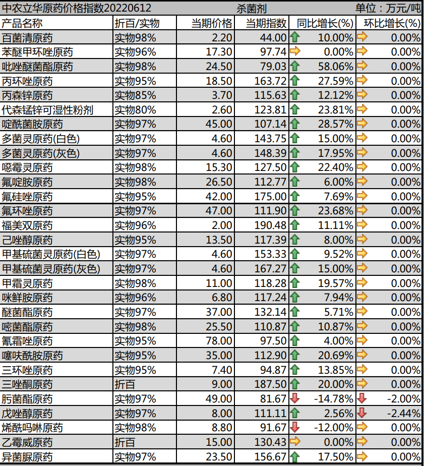 多菌靈原藥市場報價維持在4.6萬元/噸;甲基硫菌靈原藥市場價格報到4.6萬元/噸;福美雙原藥價格2萬元/噸;甲霜靈原藥價格報到11萬元/噸,噁霉靈原藥市場價格報至15.3萬元/噸,廠家開工率一般;氟啶胺原藥目前價格報26.5萬元/噸;咪鮮胺原藥廠家成本高位,需求一般,市場報到6.8萬元/噸。