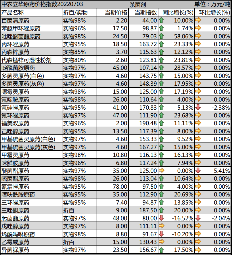 多菌靈原藥生產(chǎn)廠家環(huán)保壓力較大,市場(chǎng)報(bào)價(jià)維持在4.6萬(wàn)元/噸左右;甲基硫菌靈原藥成本壓力大,市場(chǎng)價(jià)格報(bào)到4.6萬(wàn)元/噸左右;噁霉靈原藥市場(chǎng)價(jià)格在15萬(wàn)元/噸左右;氟啶胺原藥庫(kù)存消化,出口市場(chǎng)良好,市場(chǎng)價(jià)格回落到26萬(wàn)元/噸;咪鮮胺原藥市場(chǎng)弱勢(shì),廠家成本高位,艱難維持,價(jià)格上調(diào)到6.8萬(wàn)元/噸。